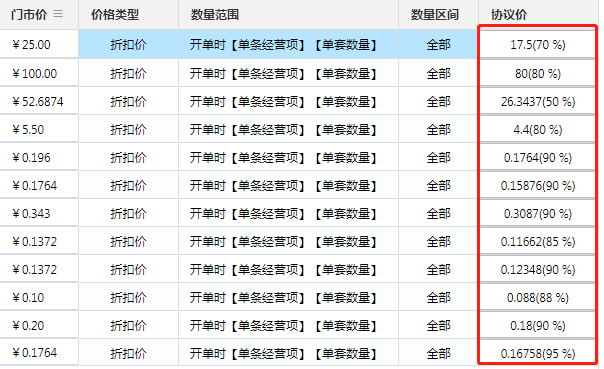 可灵活设置分组协议价内各个经营项目的折扣比例,比如利润高的折扣设置多一些,利润低的折扣设置少一点。