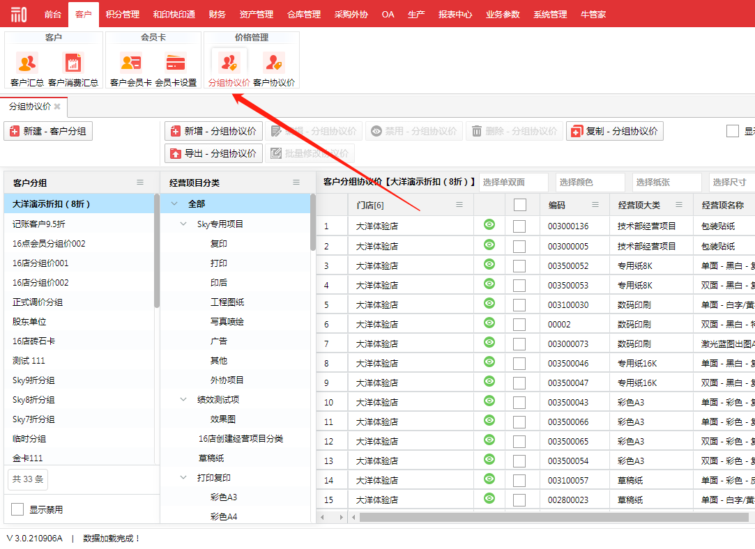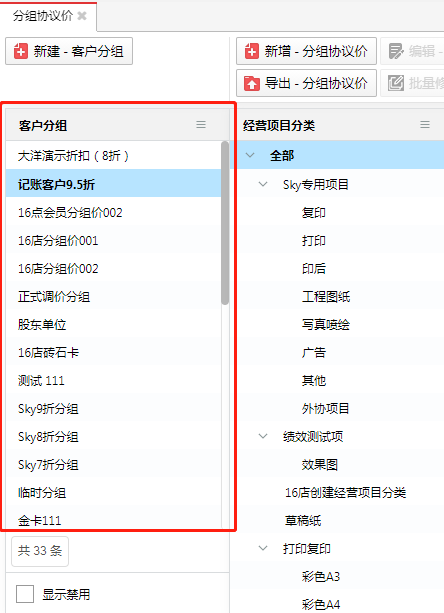 一个分组协议价可关联若干个经营项目,可按照客户的分类或需求来设置不同的打折项目,同时限定打折的范围。