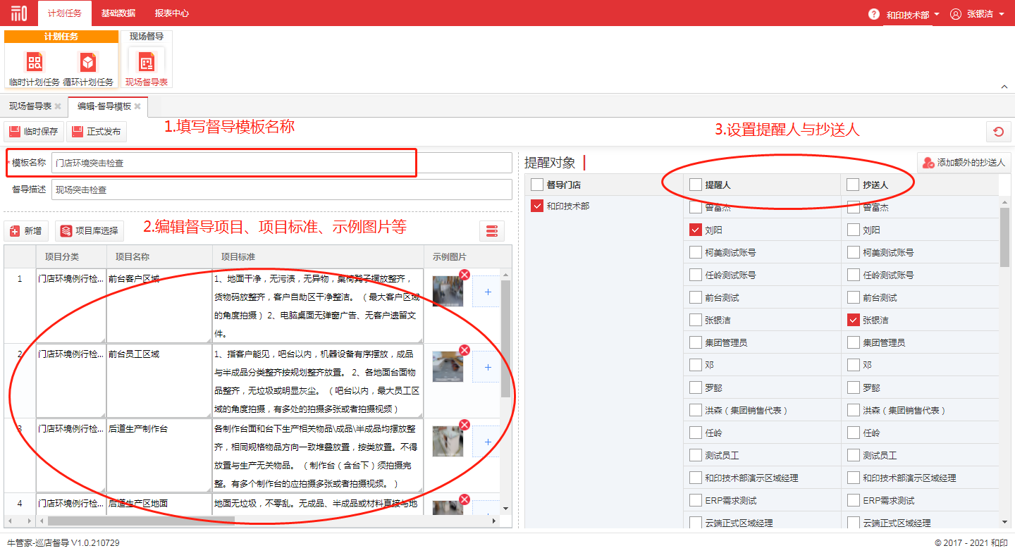 督导的权限由集团账号进行分配,以获取后台编辑与手机前端的操作权限;提醒人是门店负责项目跟进与整改的执行人、抄送人一般是老板或高管。