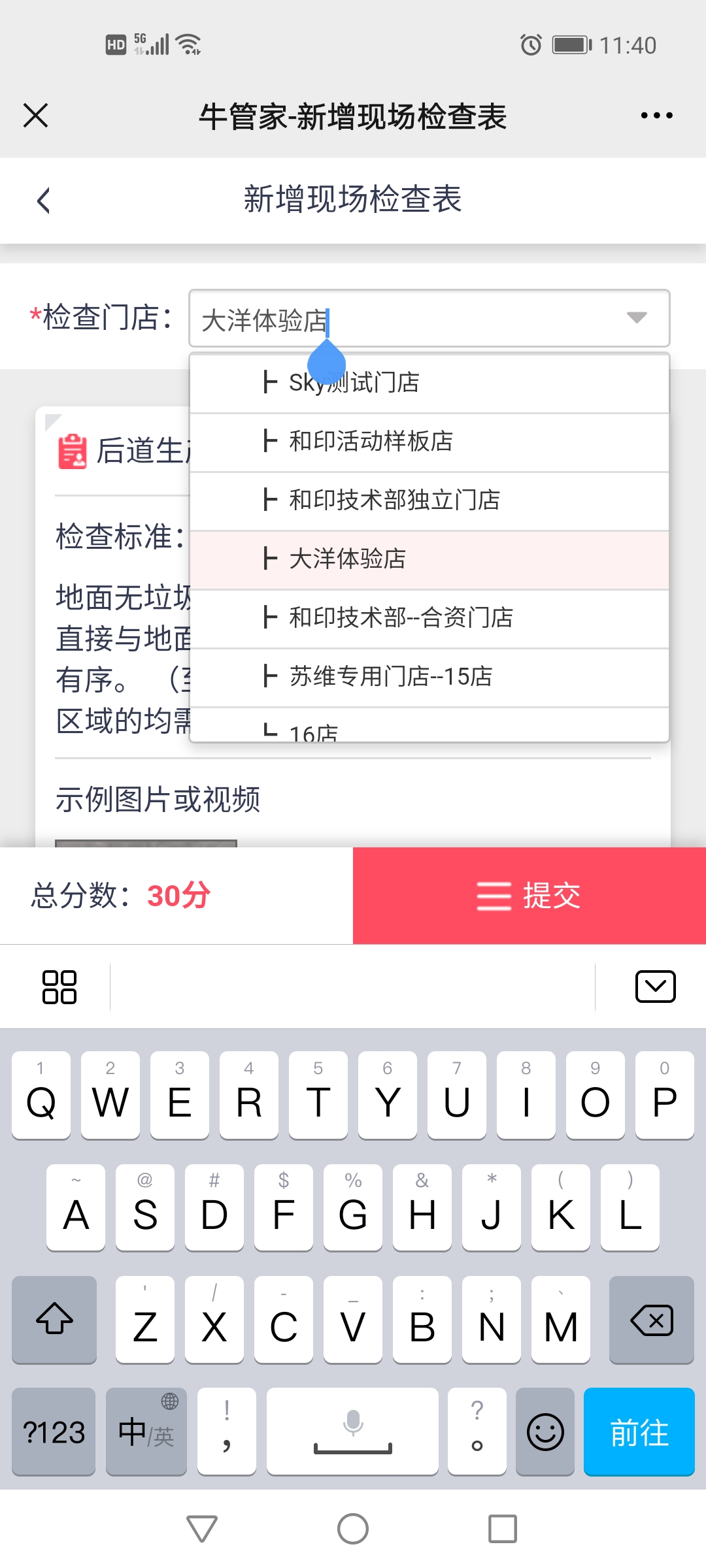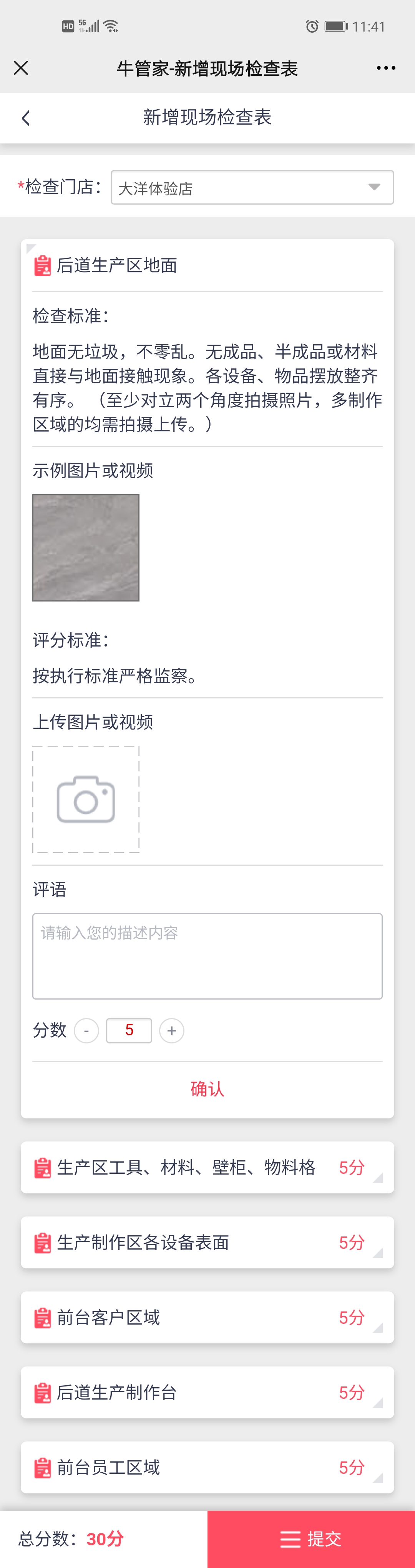 然后督导可根据督导项目及项目标准进行打分、文字描述、拍照、录视频等操作,最后点击提交,有问题的项目可提交给【提醒人】进行整改。